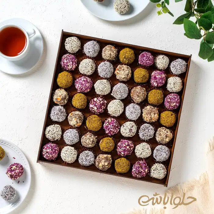 - شامل 49 عدد ترافل خرما + تکههای گردو + ادویهجات مخصوص با تزئینات آجیلی