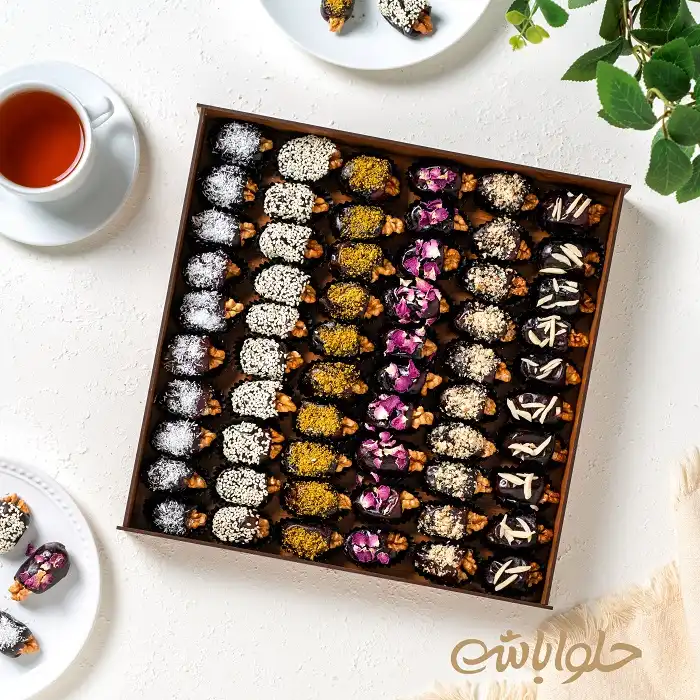 - شامل 60 عدد خرما رطب اعلا با مغز گردو همراه تزئینات آجیلی